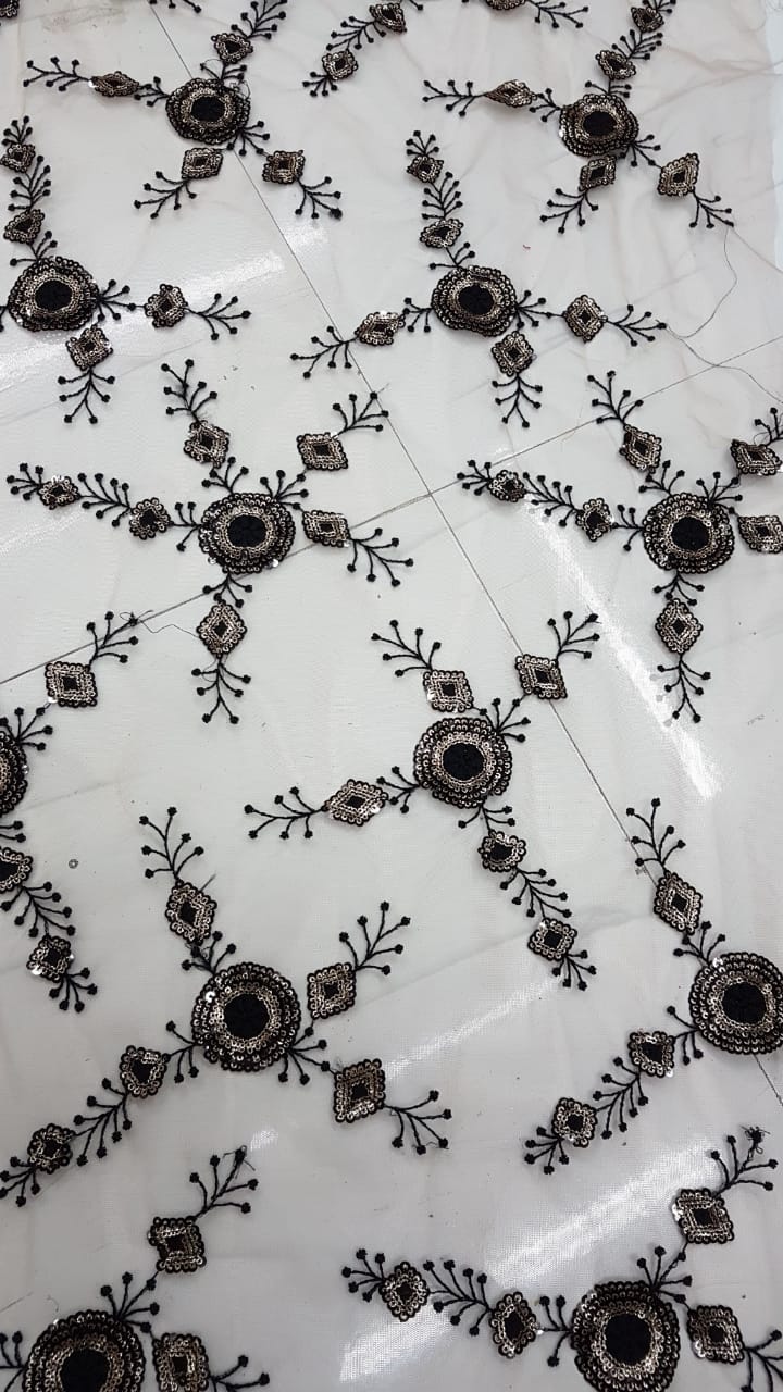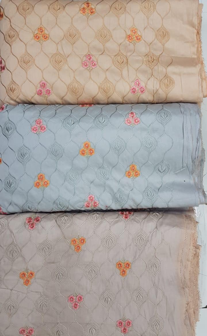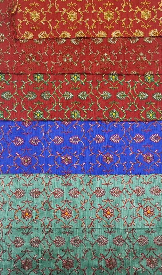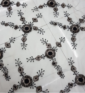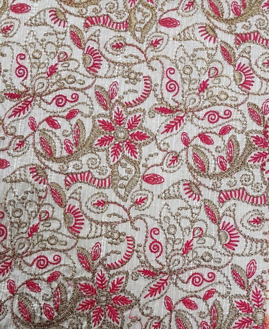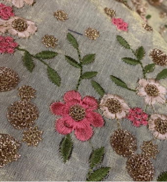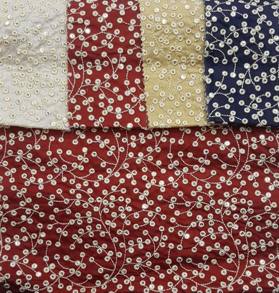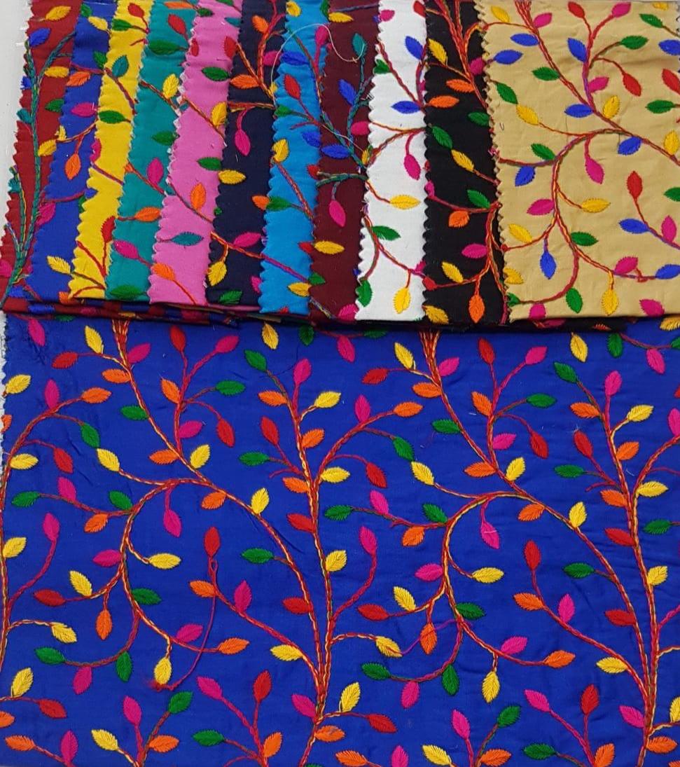 Schiffli, multi head, single sequins, sandwich sequins, four sequins, chain stitch, cording, ram leela pattern and many more embroidery available on net, silk, denim, cotton, jam satin, dupian silk, chiffon, georgette, viscose, muslin etc. and can be used in ladies wear, gents wear, kids wear, home décor, accessories like face masks, foot wear, hand bags etc.