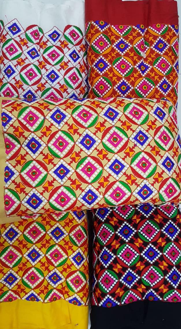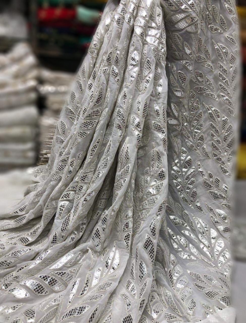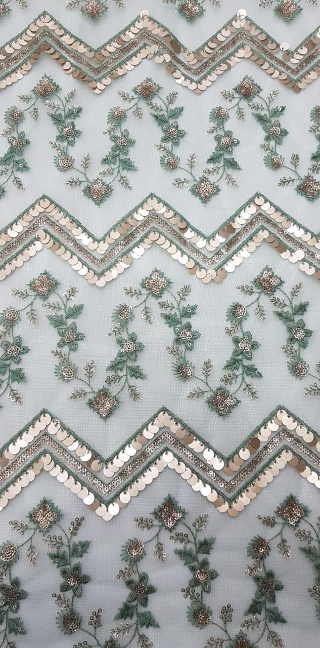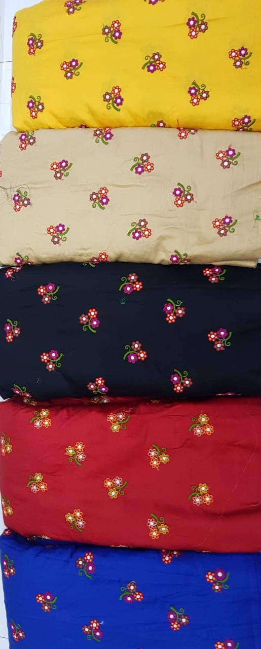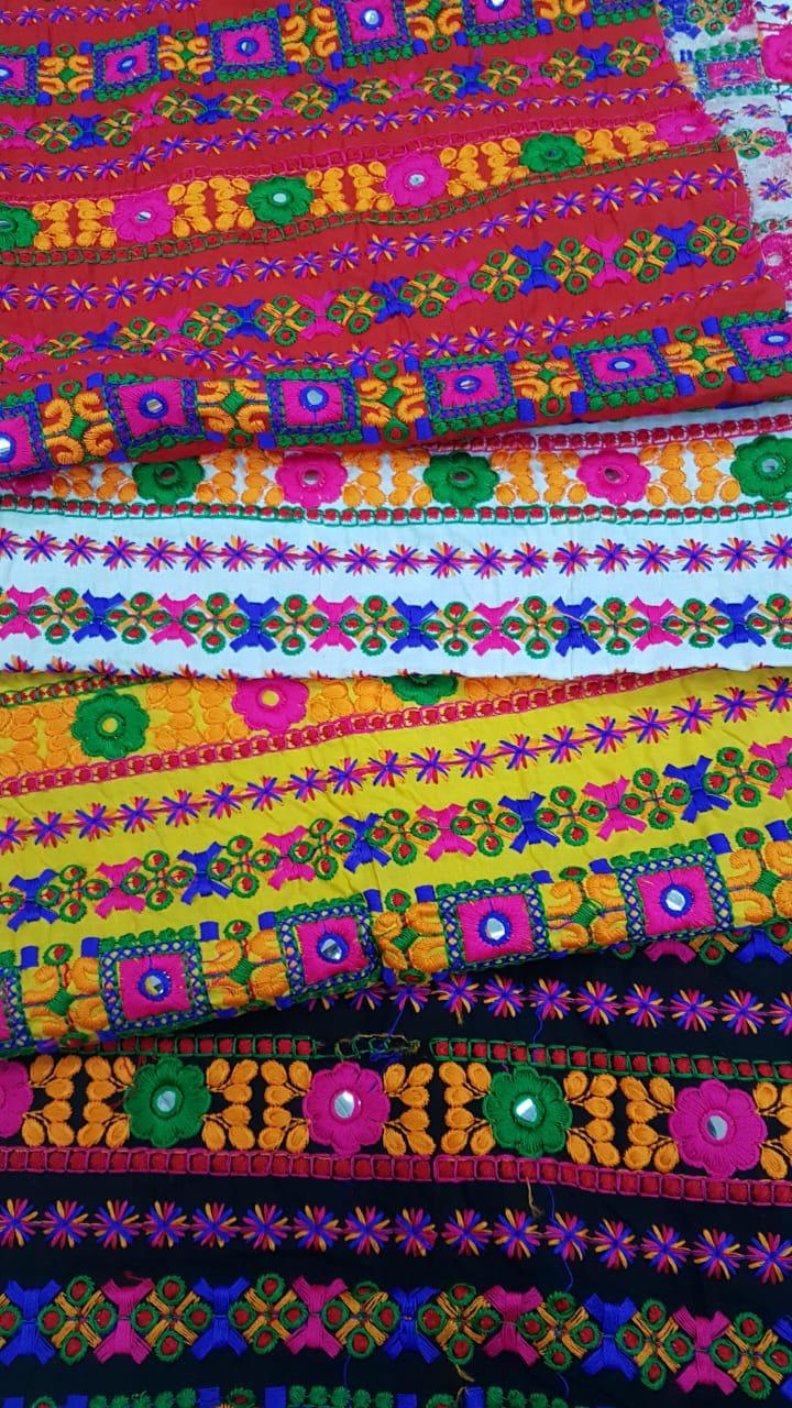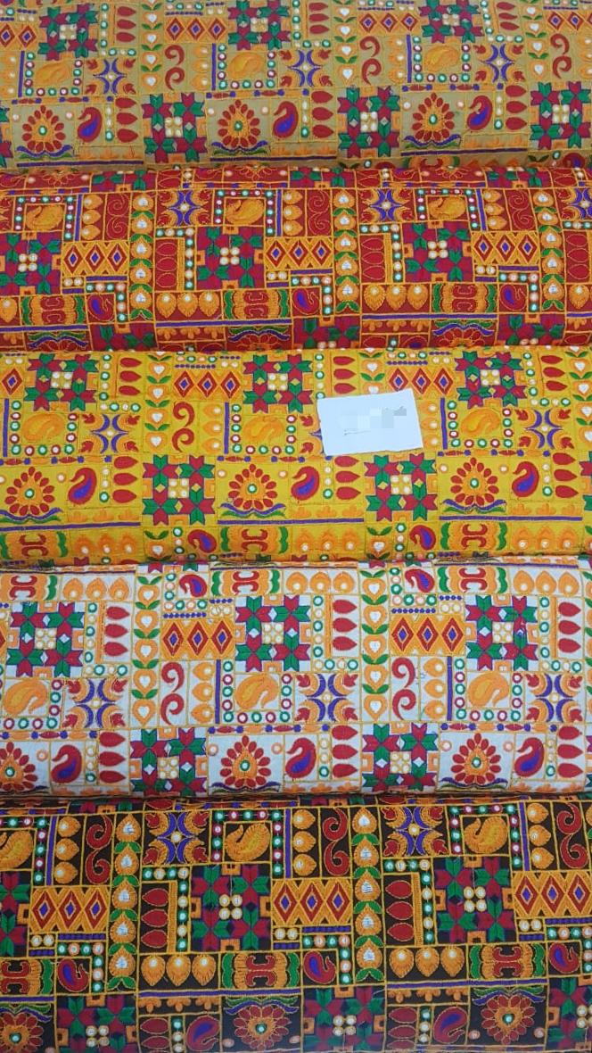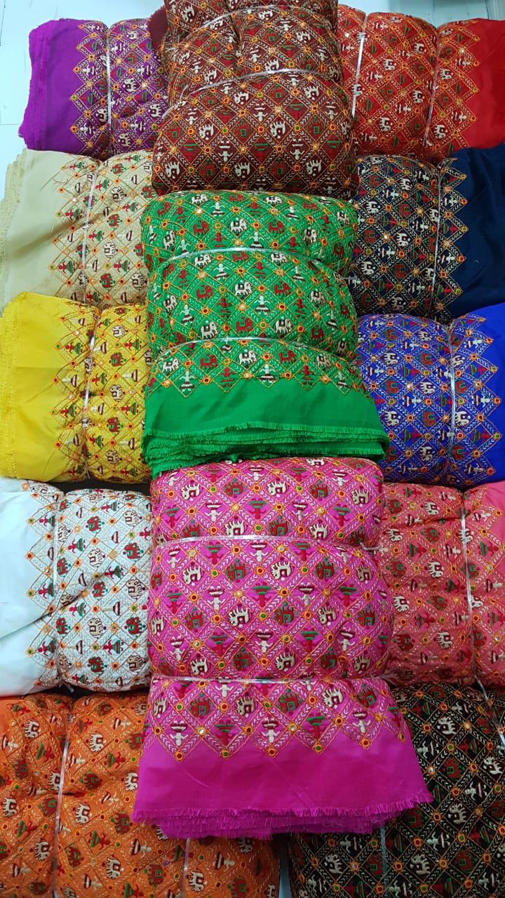 Schiffli, multi head, single sequins, sandwich sequins, four sequins, chain stitch, cording, ram leela pattern and many more embroidery available on net, silk, denim, cotton, jam satin, dupian silk, chiffon, georgette, viscose, muslin etc. and can be used in ladies wear, gents wear, kids wear, home décor, accessories like face masks, foot wear, hand bags etc.